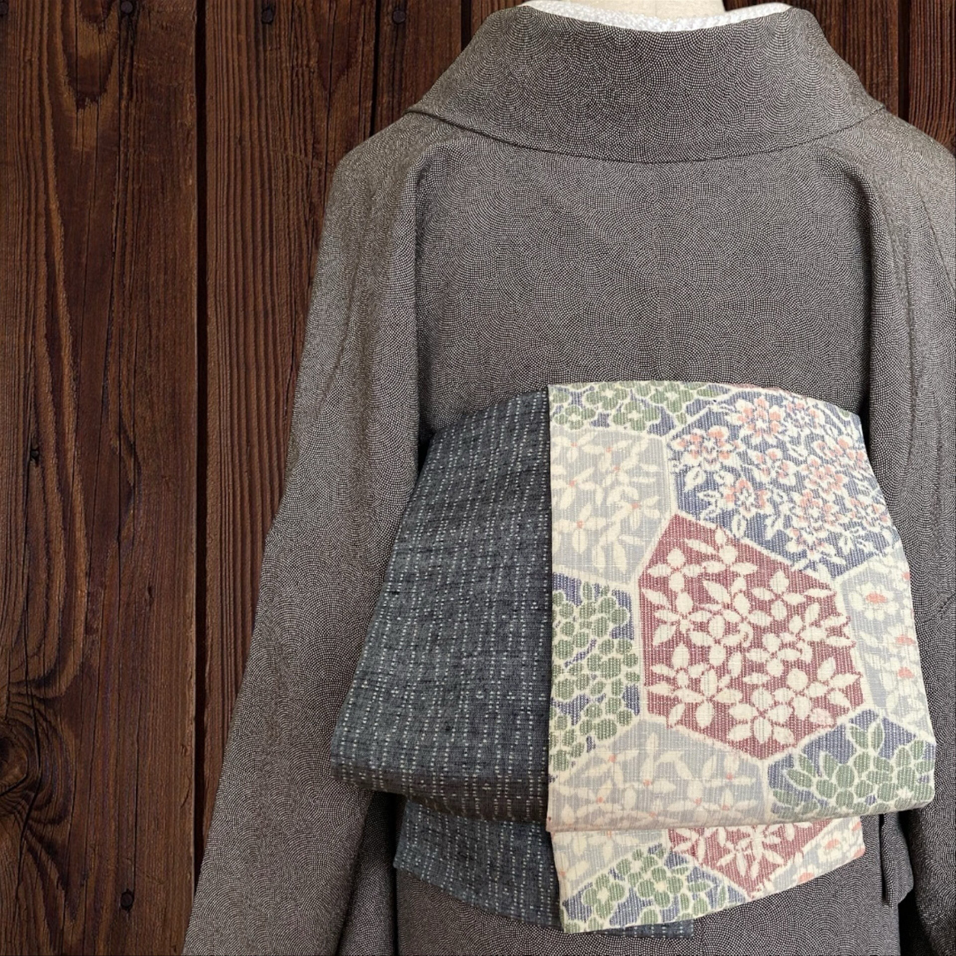 結城紬 草花灰青と青灰色幾何学模様でお作り致しました半幅帯です。