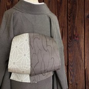 大島紬 灰茶色 幾何学模様と西陣 灰白色 麻の葉 蚊絣でお作り致しました半幅帯です。