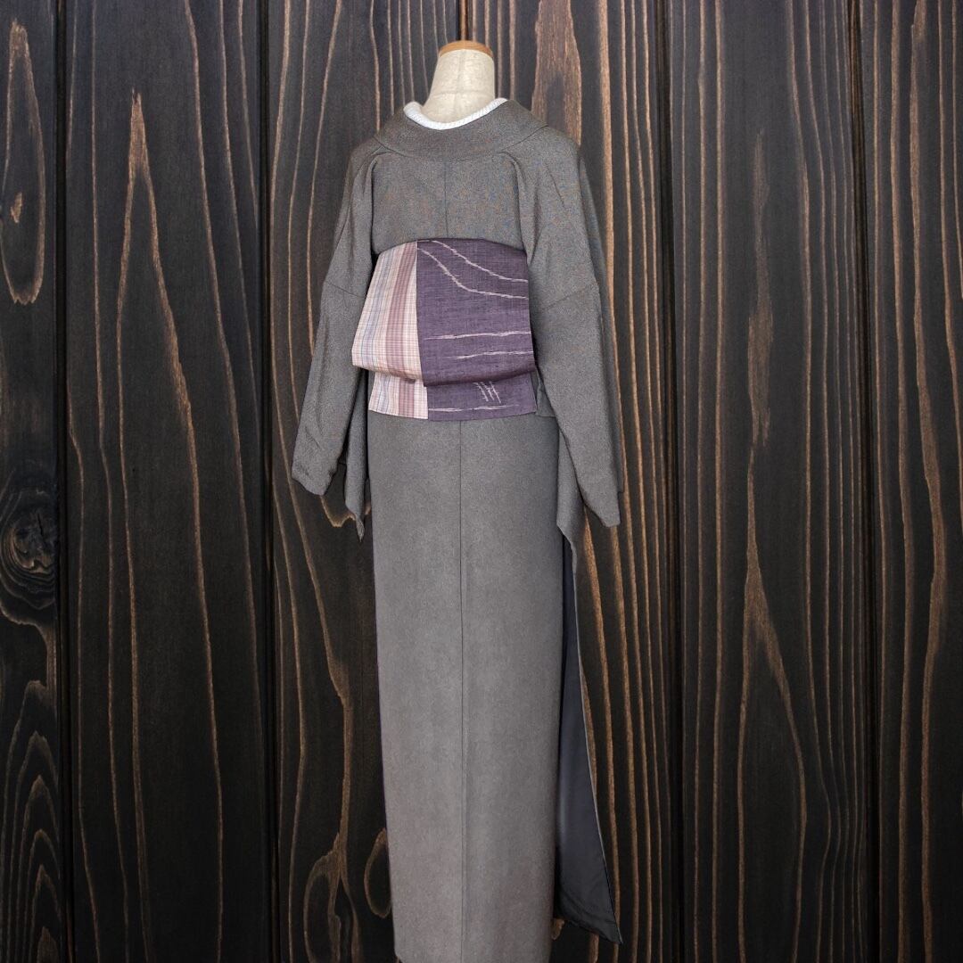 *着物反物* 灰紫幾何学紬と草木八丈紬 大人の兵児帯 半幅帯 長尺455cm