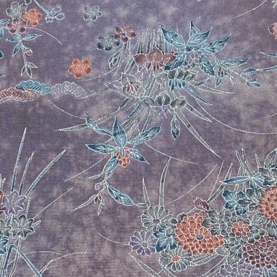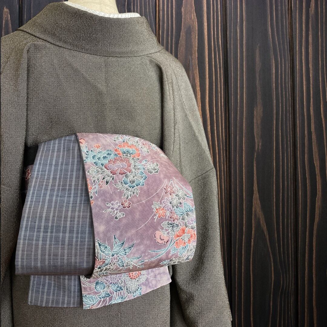 縮緬染め菊草花更紗紫と伊吹間道縞灰紫でお作り致しました半幅帯です。