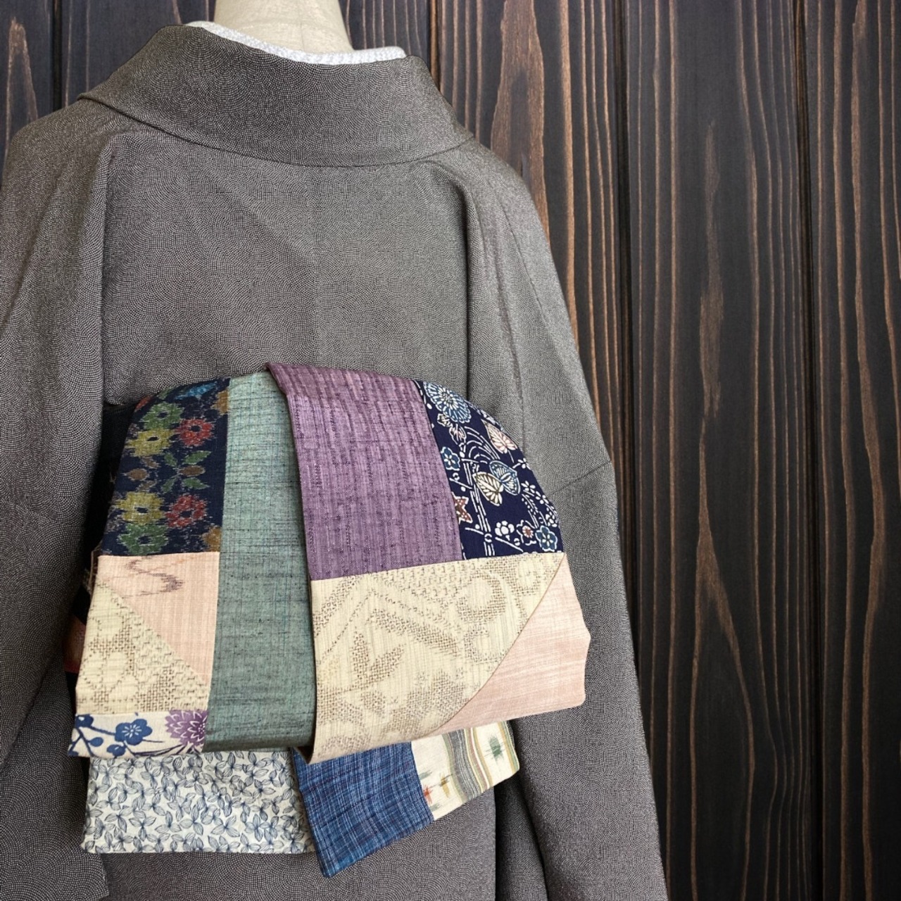 そして色々な形のパッチワークにして半幅帯に致しました。