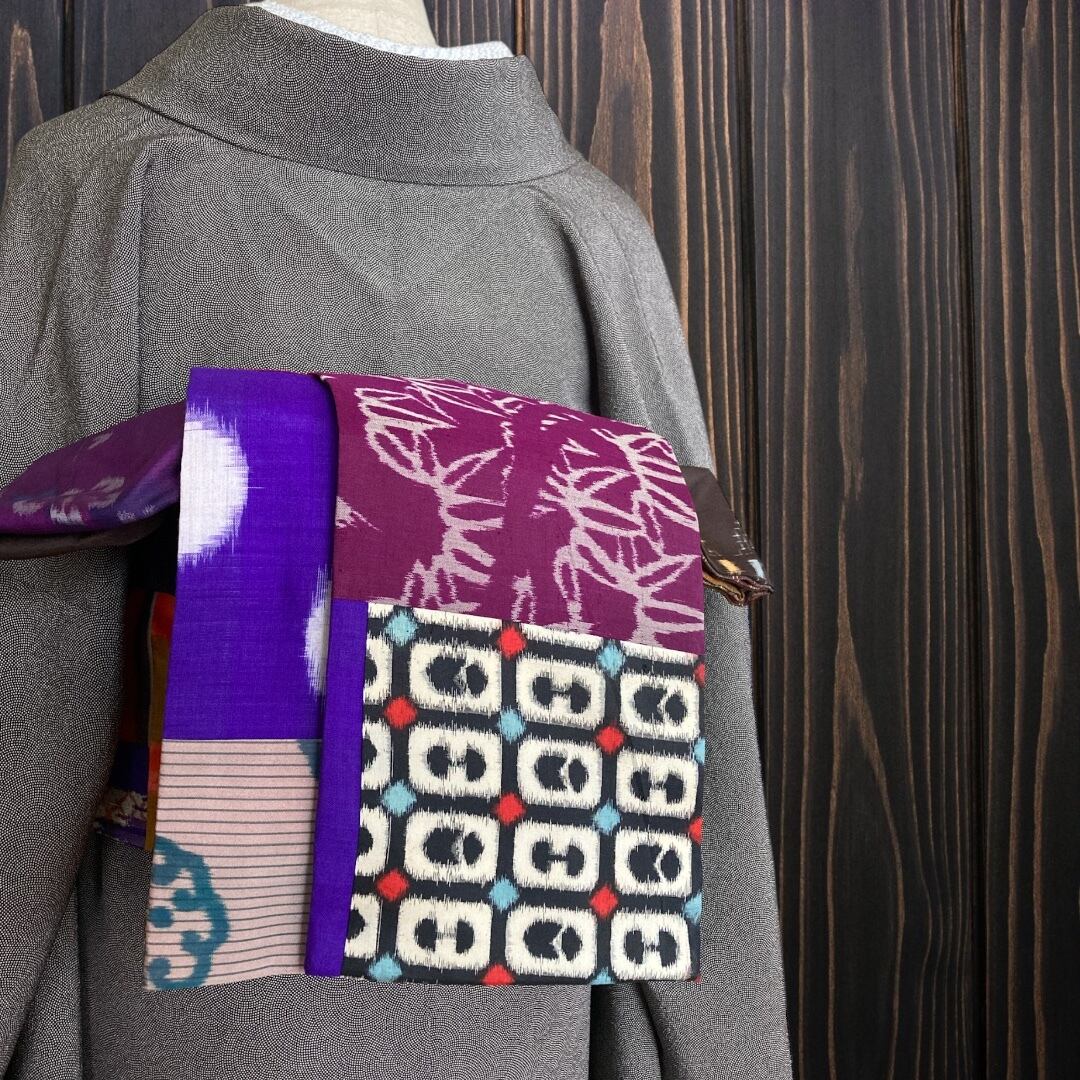 MIXしたお色味と柄でお作り致しました半幅帯です。