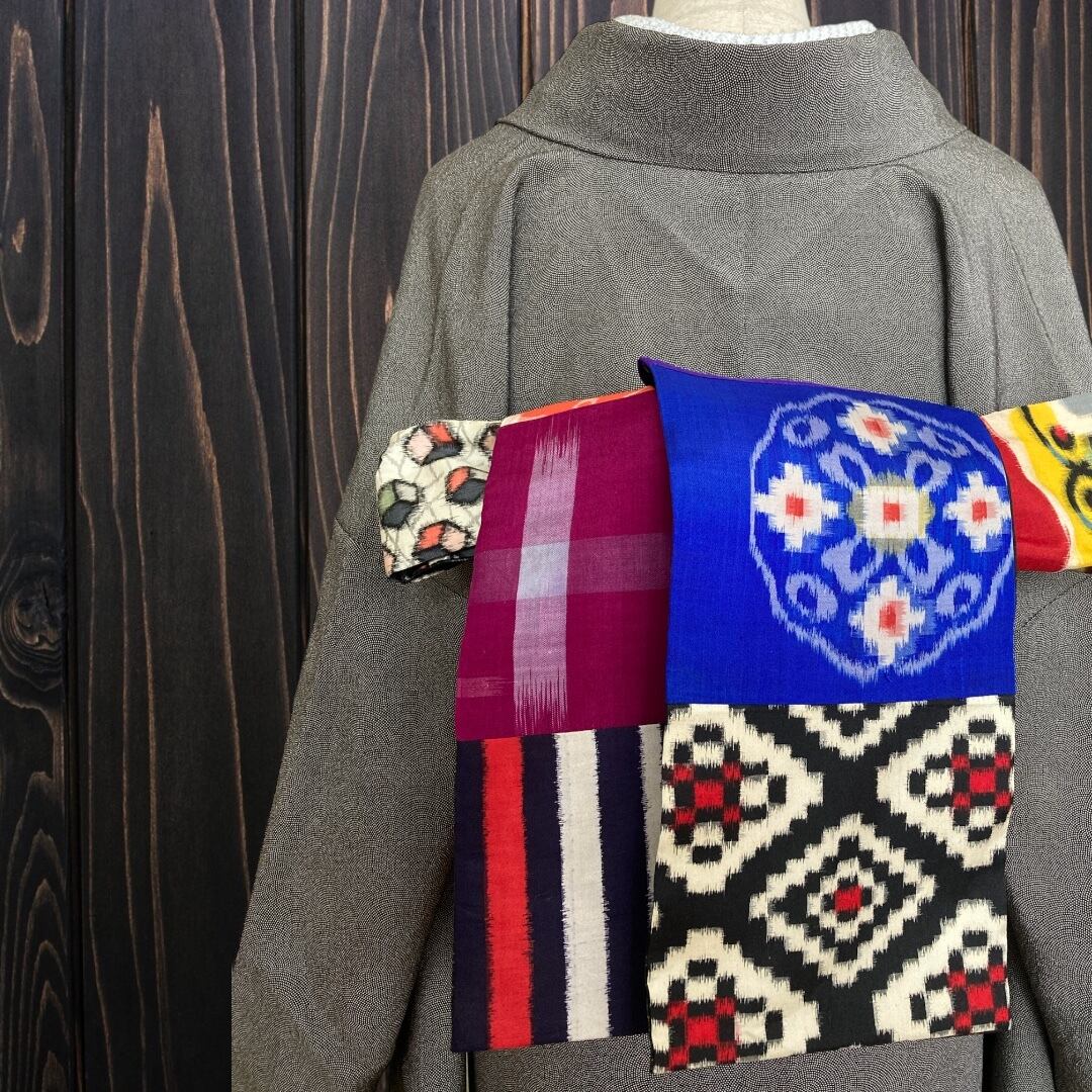 var.84アンティーク着物リメイク.切嵌風.銘仙.大人の兵児帯 半幅帯 パッチワーク 長尺430cm