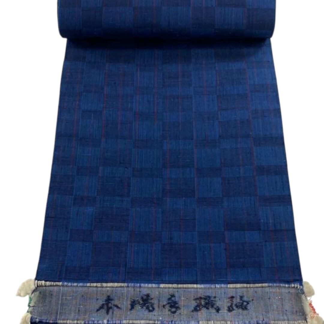 結城紬は藍色と紺色で市松模様が織られており赤の糸で縞を作っている生地で、しっかりしています。