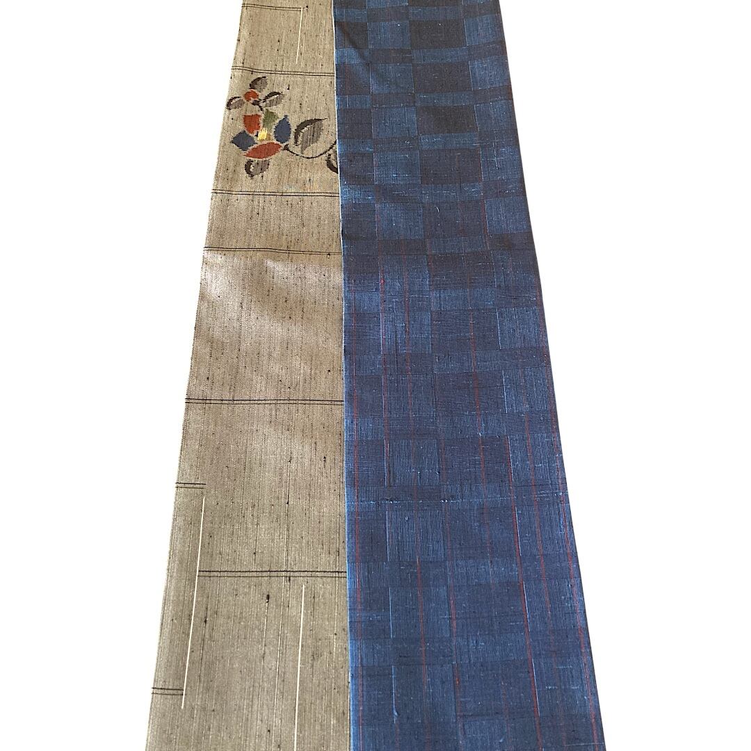 *着物反物* 結城紬変わり市松柄と椿柄 大人の兵児帯 半幅帯 長尺450cm