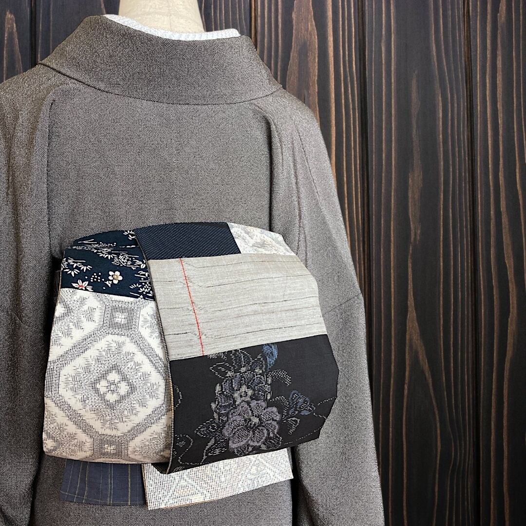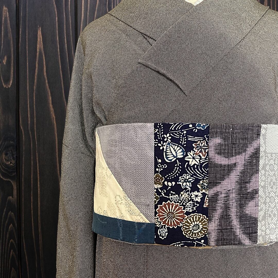 そして色々な形のパッチワークにして半幅帯に致しました。