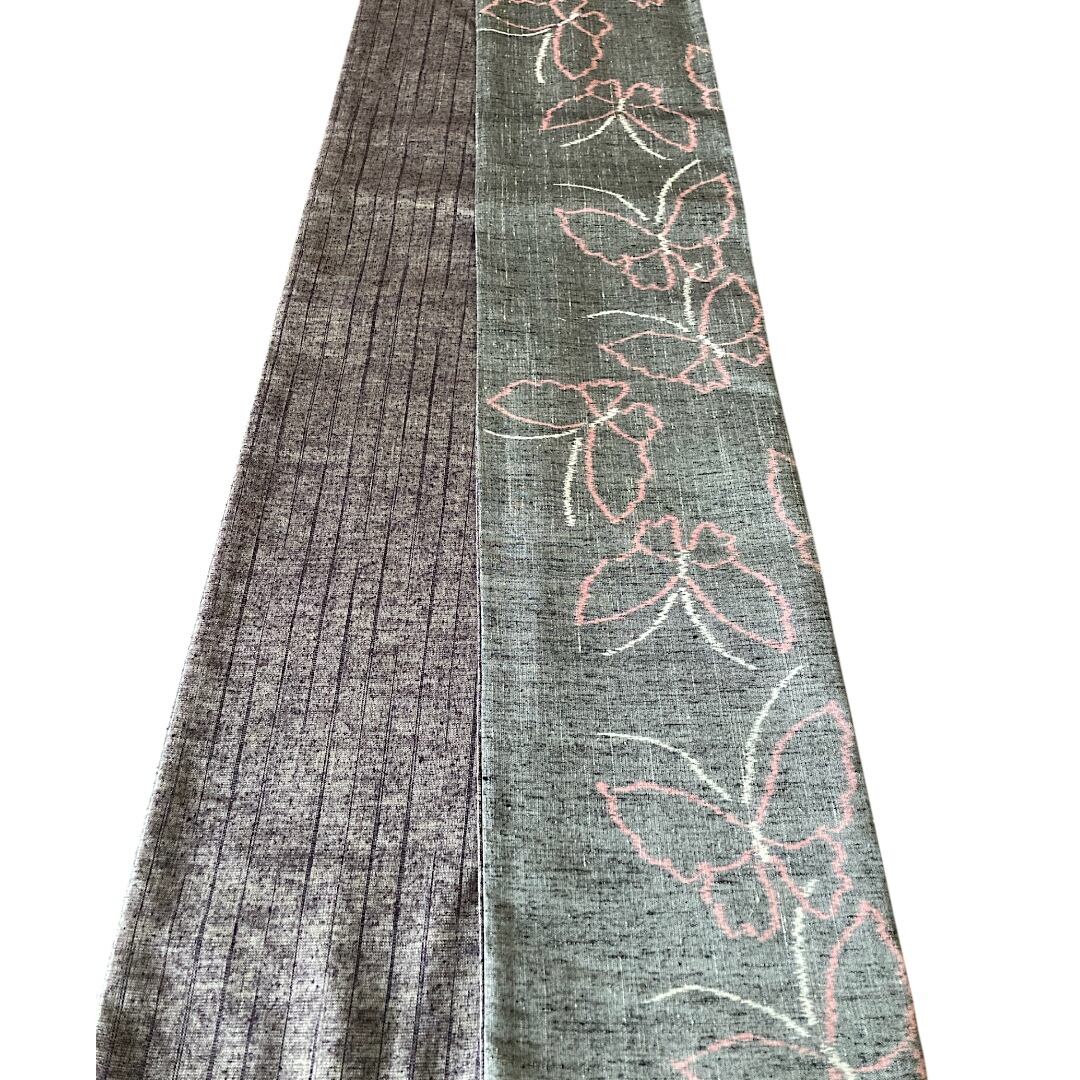 織のしっかりした蝶柄の紬と柔らかな手触りの灰紫縞柄でお作り致しました半幅帯です。