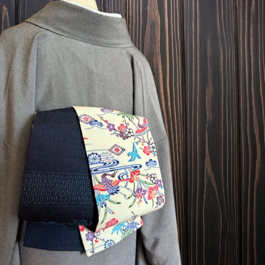 紅型クリーム地 鶴 松竹梅と藍色 草花亀甲絣でお作り致しました半幅帯です。