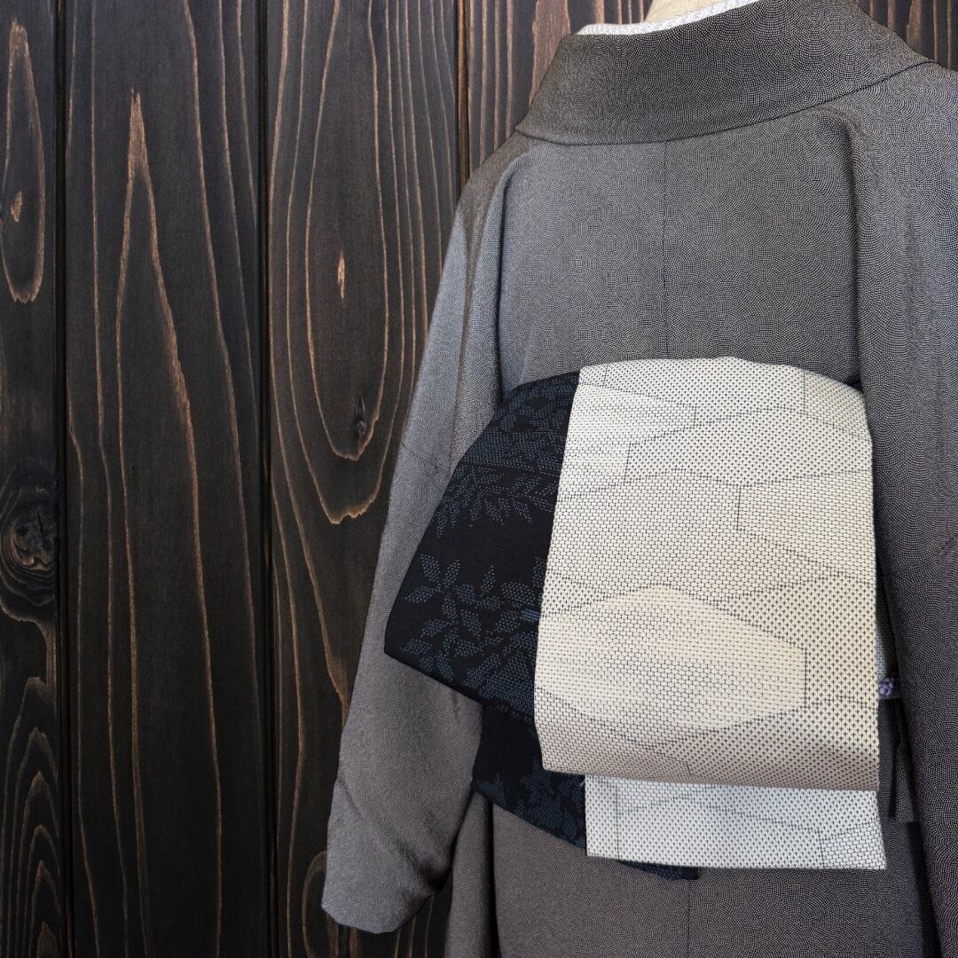 寄せ柄灰色絣と結城紬ヱ霞でお作り致しました半幅帯です。