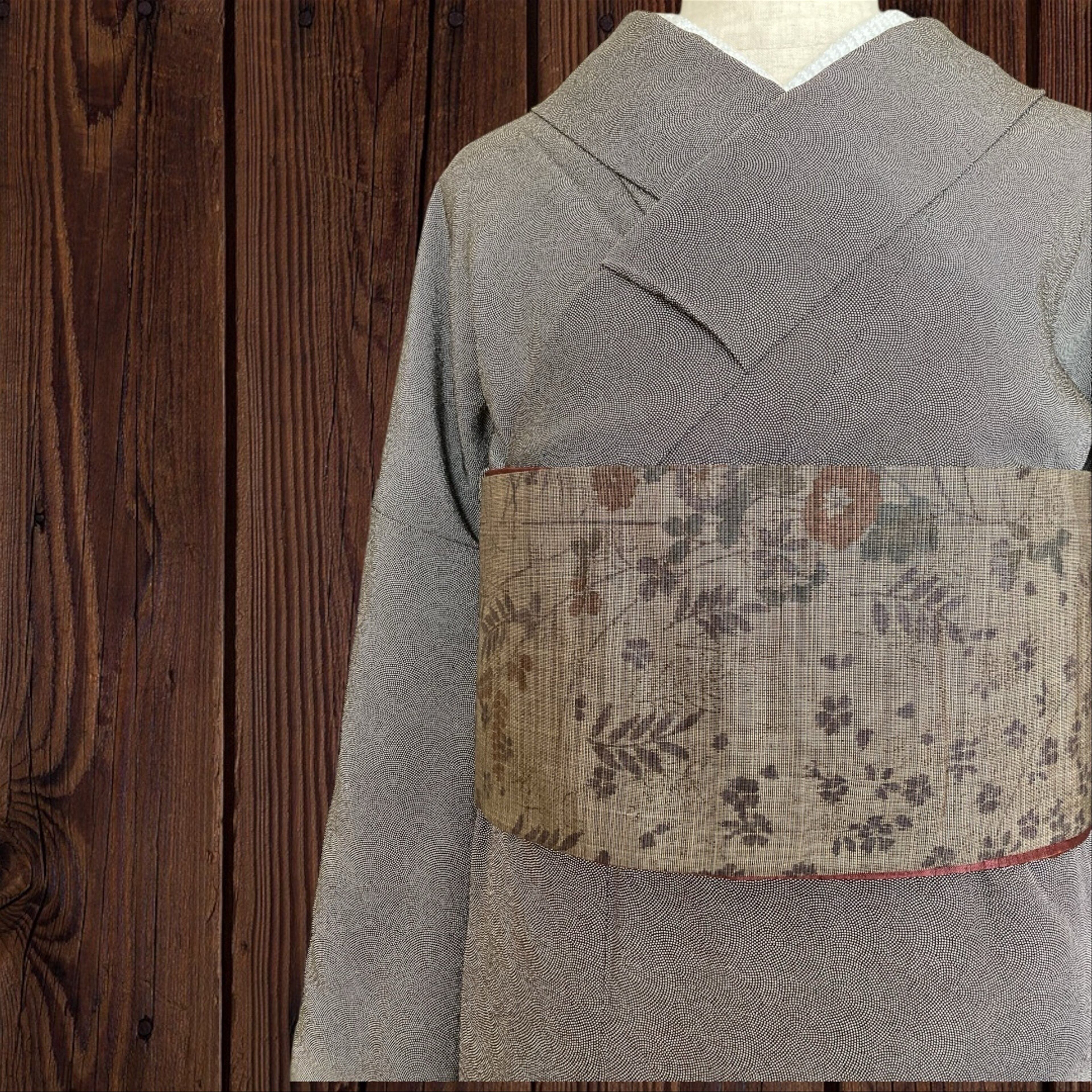 茶色地に辻ヶ花草花を織り込んだ紬と赤茶色織柄のある優しい真綿紬でお作り致しました半幅帯です。