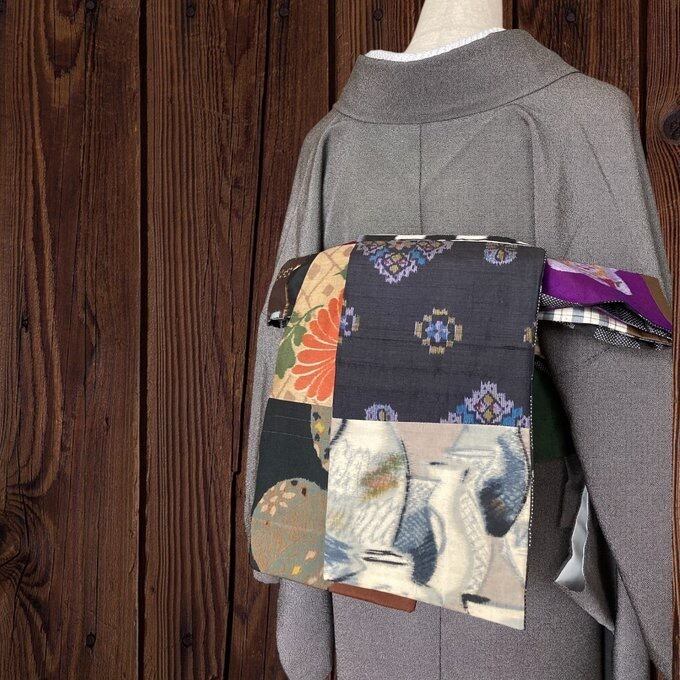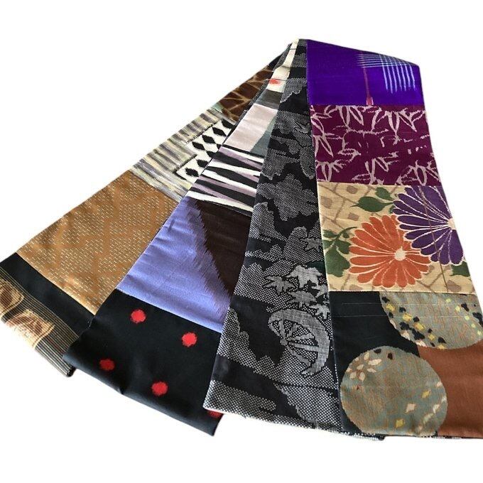 var.65 アンティーク着物リメイク.切嵌風.銘仙.大人の兵児帯 半幅帯 パッチワーク 長尺490cm