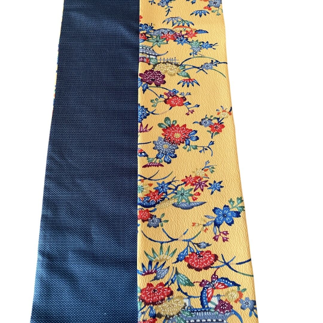 辛子色の紅型と男物大島紬亀甲でお作り致しました半幅帯です。