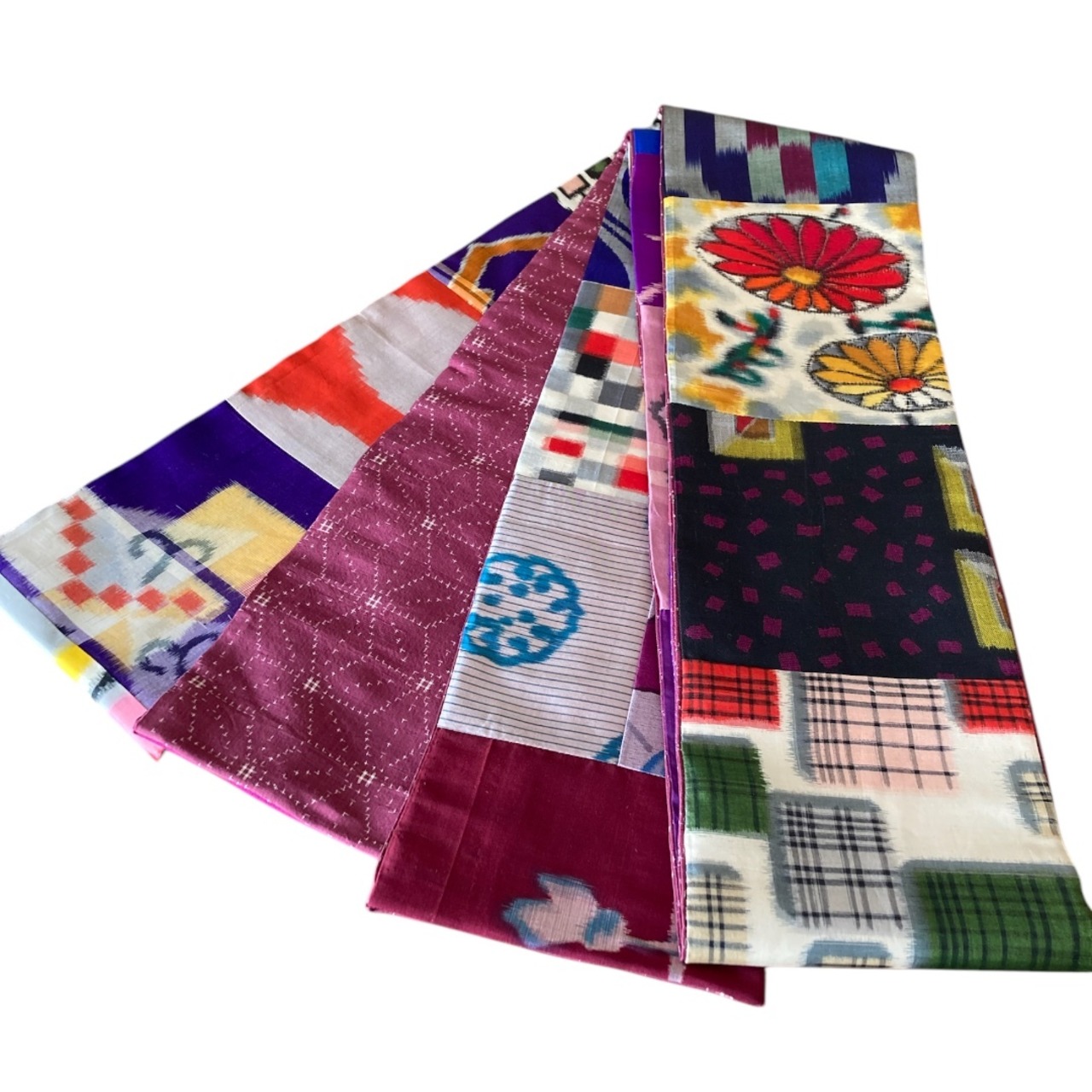 幾何学模様やお花柄など約30枚のアンティーク布を使っています。柄の出具合の楽しみもありますよね。