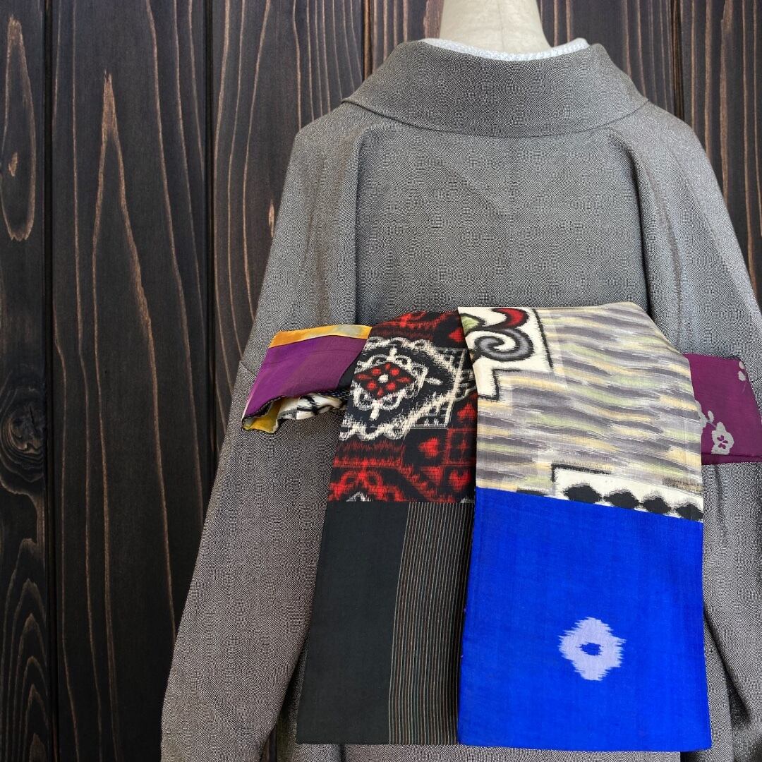 var.70 アンティーク着物リメイク.切嵌風.銘仙.大人の兵児帯 半幅帯 パッチワーク 長尺455cm