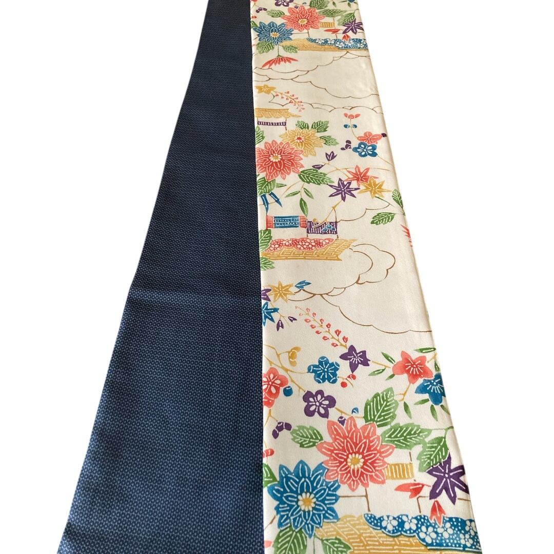 縮緬 草花 建物 クリームと大島紬紺色亀甲柄でお作り致しました半幅帯です。